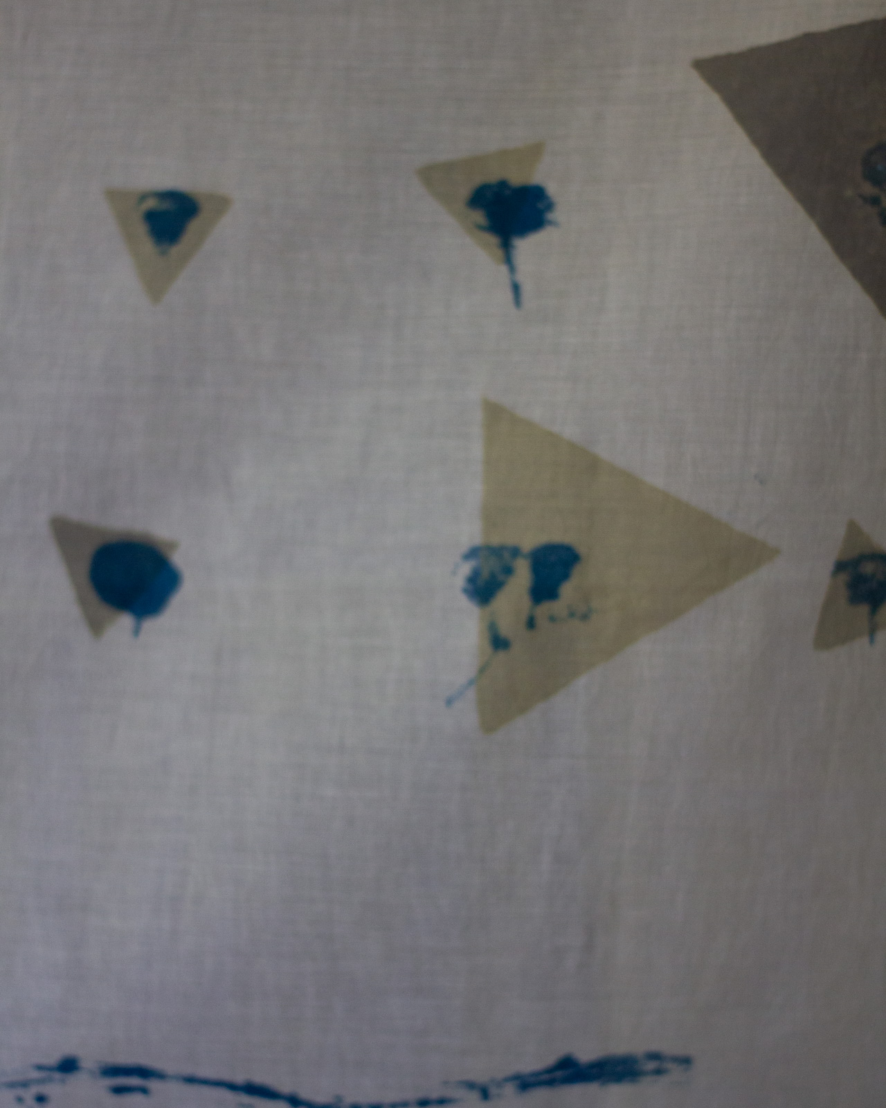 伝統的なアジュラクプリントでは、ずれやかすれがなく、きっちりしているものが良しとされていますが、向井さんの作品ではあえて、意図的にずれやかすれを強調しているものもあります。