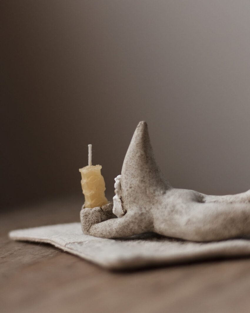 火を灯すとき、サンタを不燃性のお皿にのせてください。