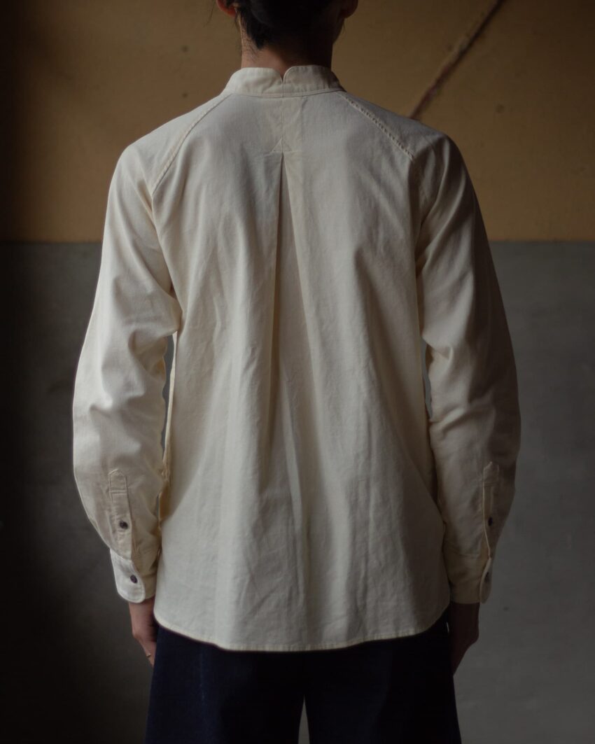 スタンドカラーのシャツでかちっとしているのに、どこか力のぬけたひひひらしい一枚。
