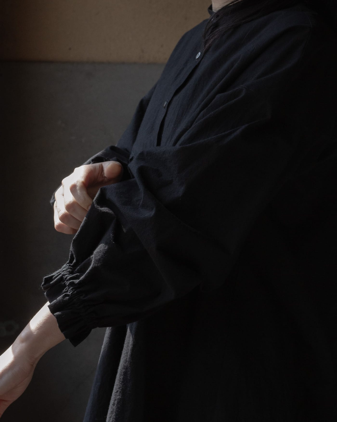 前後のカーブしたヨークが特徴のブラウスで、袖口はゴム仕様になっています。甘くなりすぎず、シーズン問わず着ていただけます。